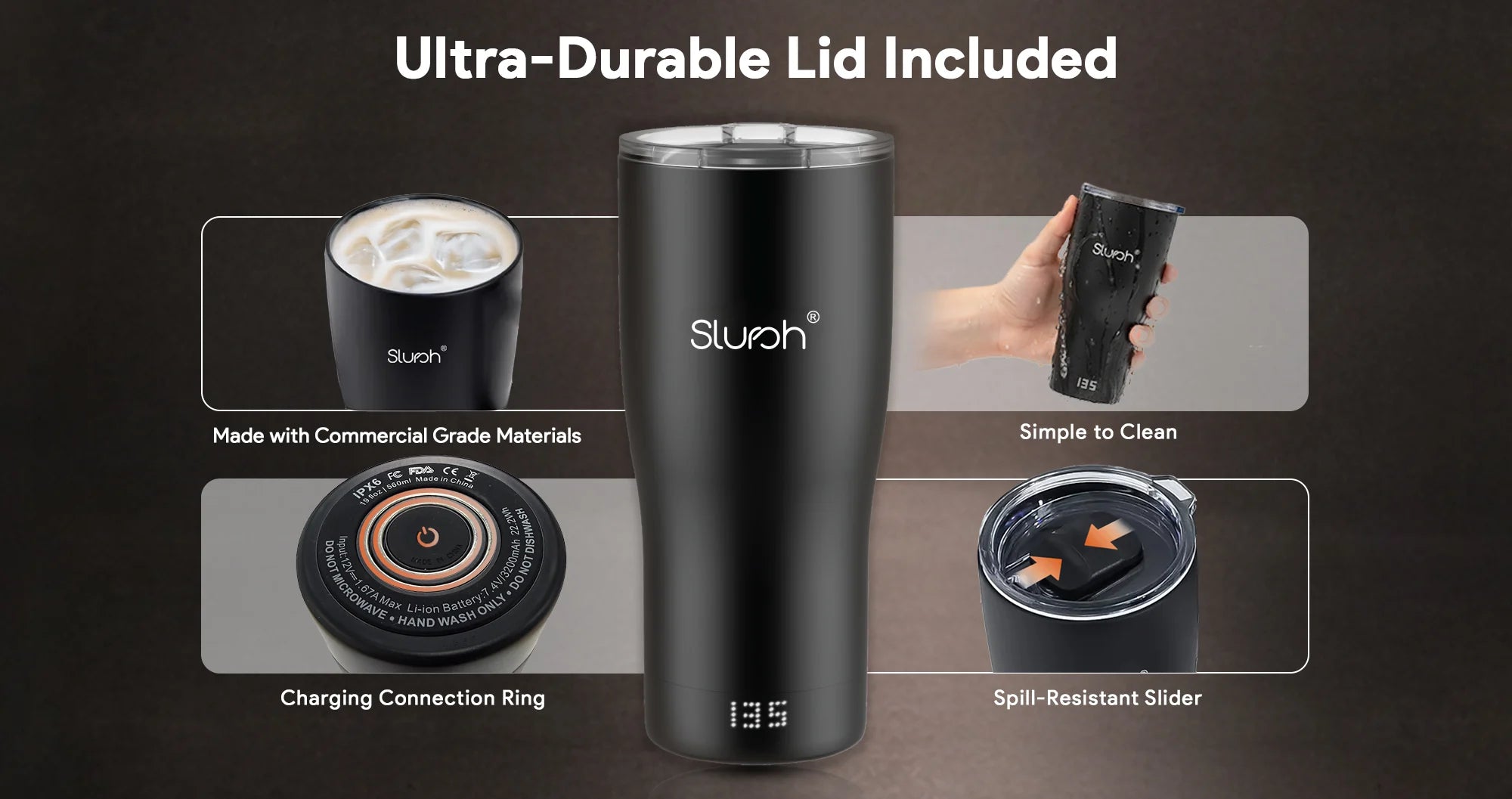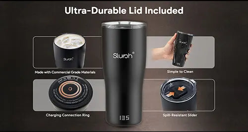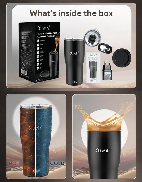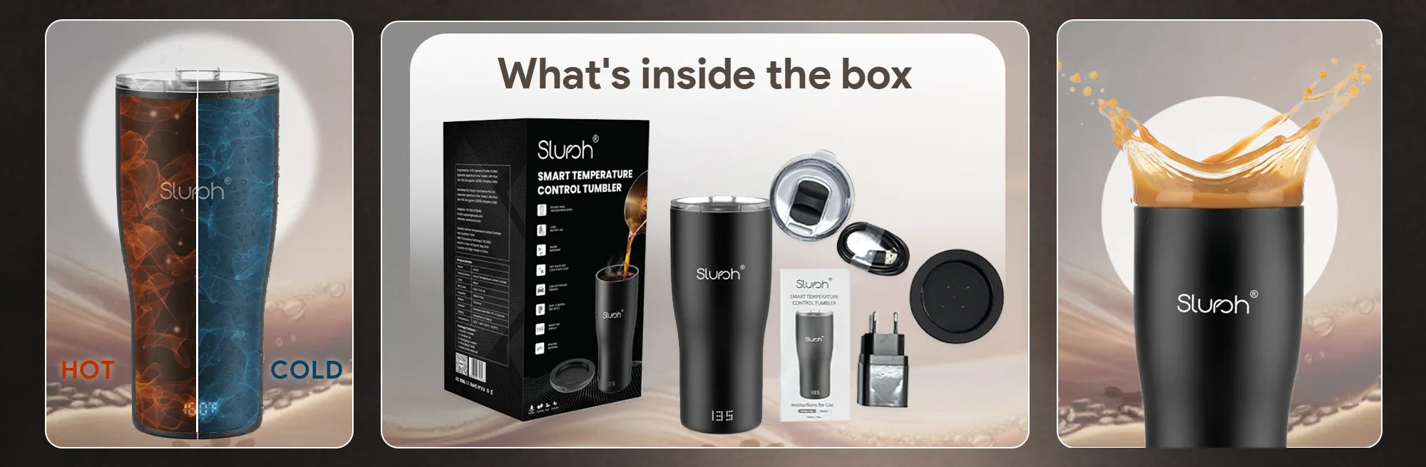 Tumbler, leak-proof lid, wireless charger coaster, USB-C cable, user manual, quick-start guide.