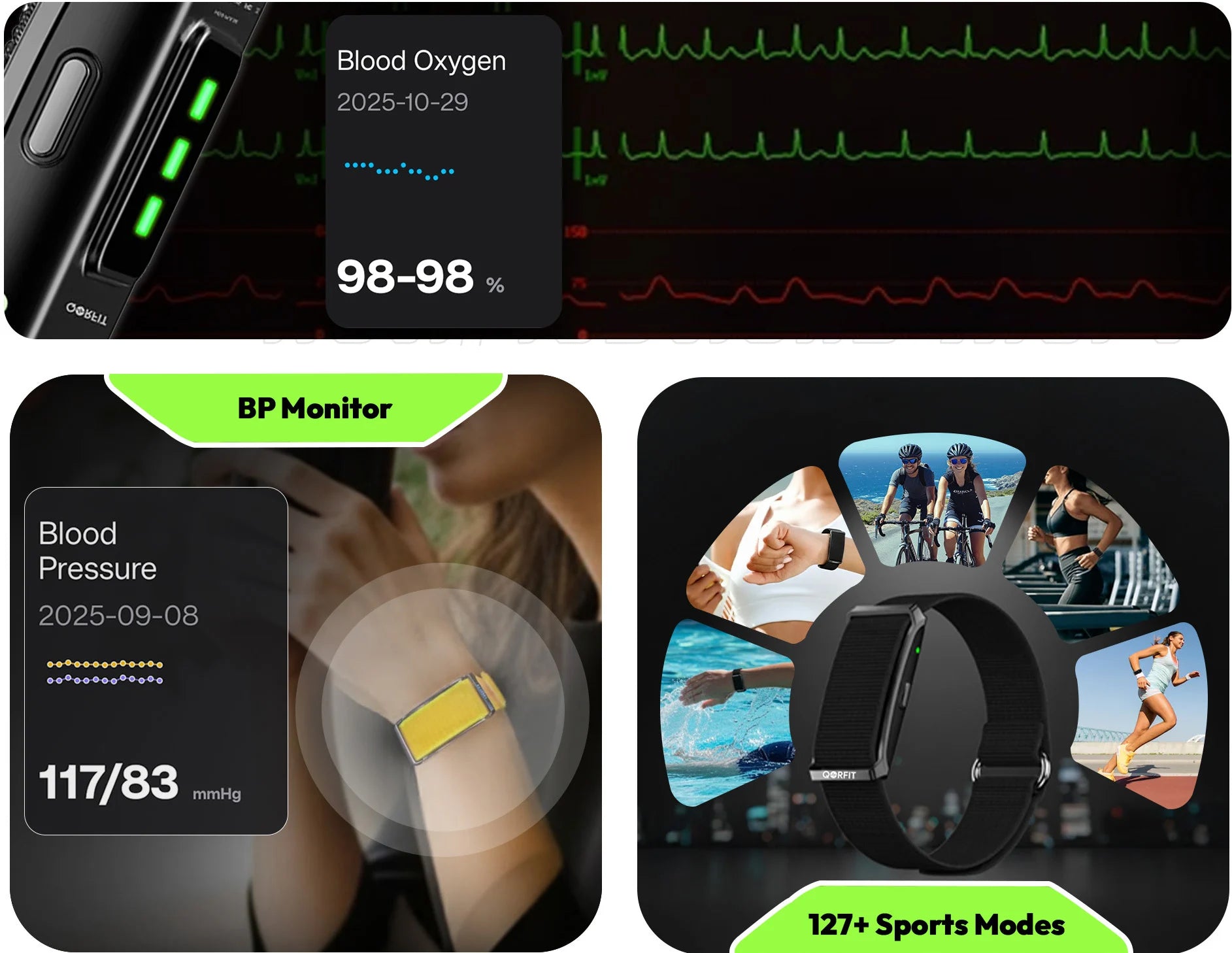 Two bands are included with the Qorfit Pulse: one black nylon and one black silicone. Colour bands are sold separately in packs of 5, available in two types — EVERYDAY CORE and VIBE CORE.